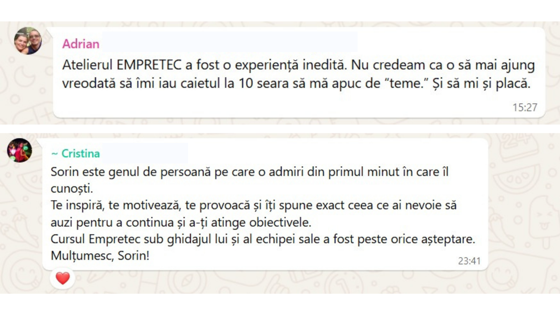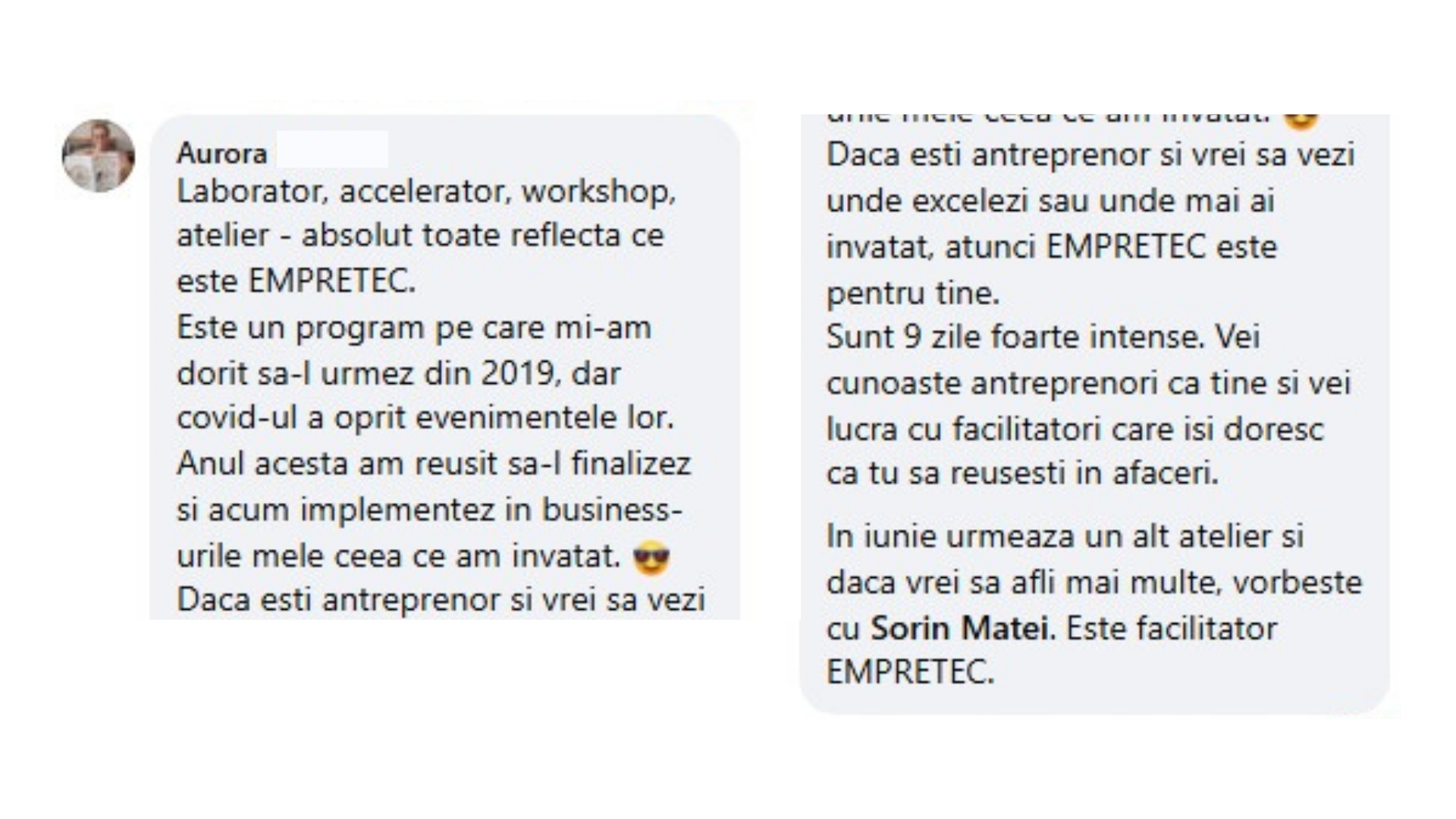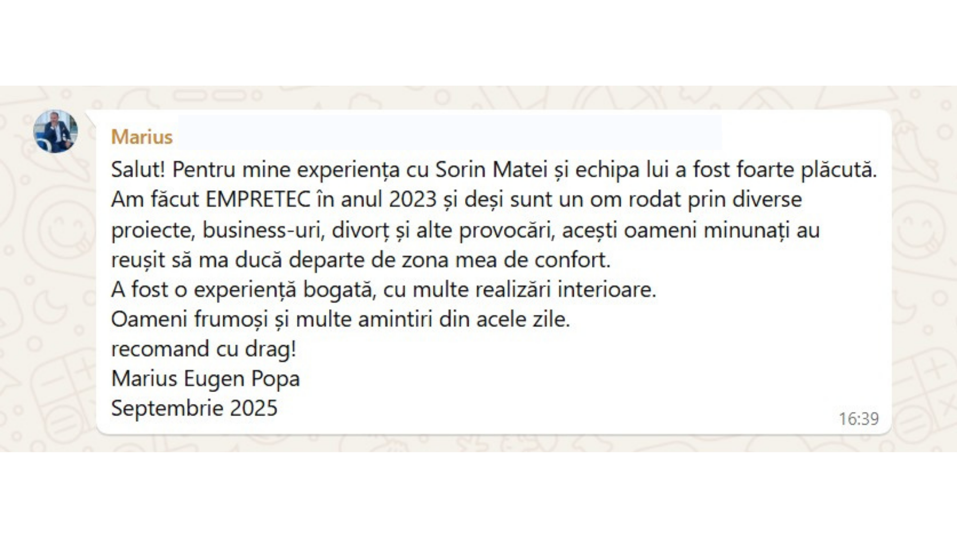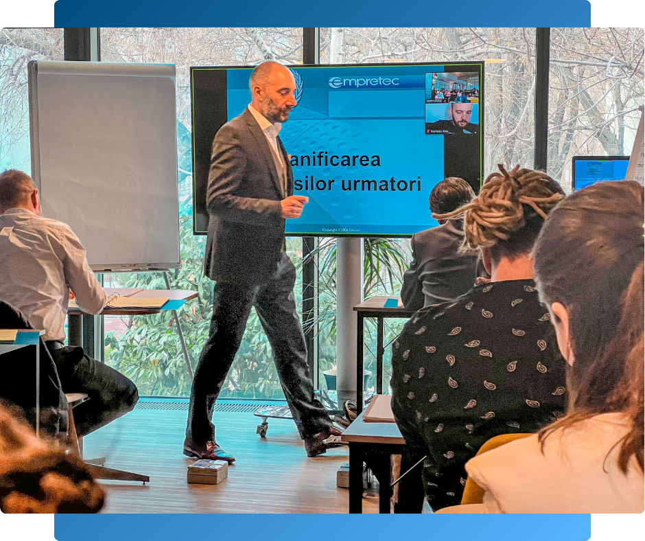 ...ești dispus să te dedici 100% unui proces care te va scoate complet din zona de confort. Empretec înseamnă 9 zile consecutive de muncă intensă cu tine însuți. Trebuie să fii pregătit să lași businessul deoparte și să intri într-o experiență solicitantă, inconfortabilă, dar profund transformațională.