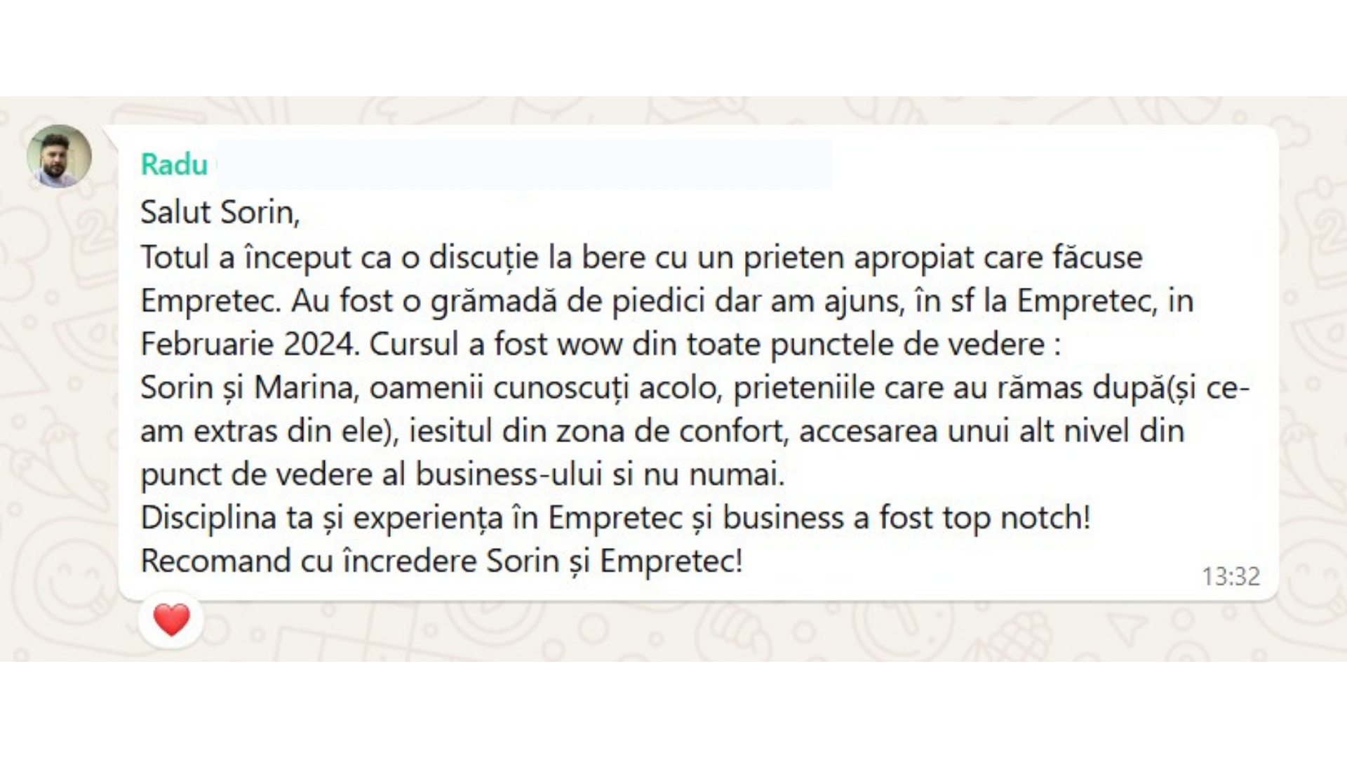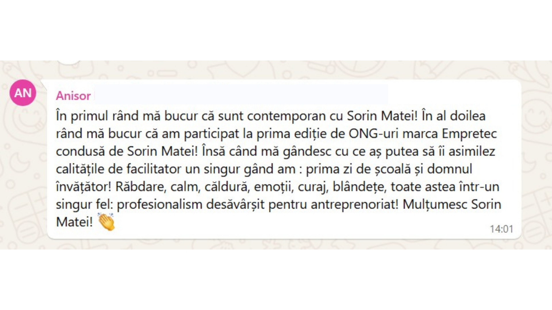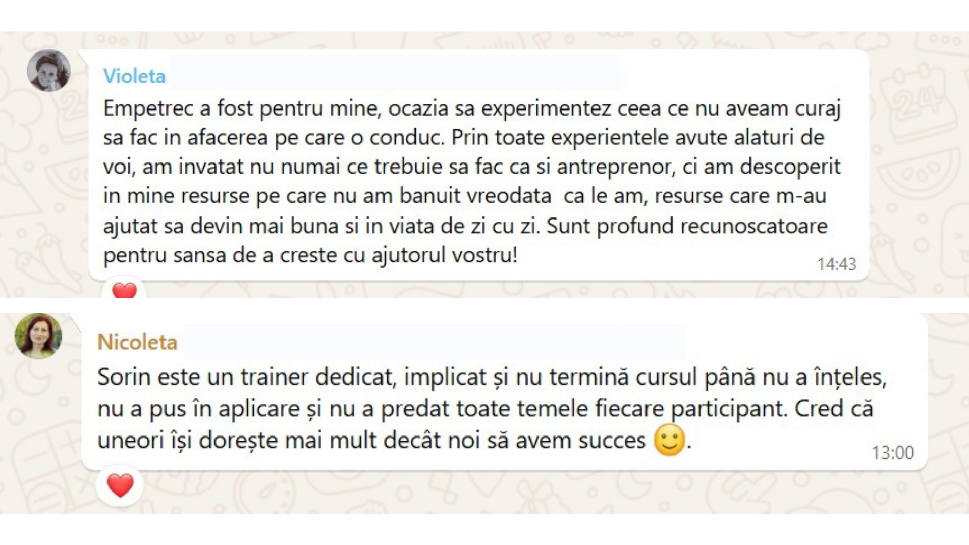 ...ești dispus să te dedici 100% unui proces care te va scoate complet din zona de confort. Empretec înseamnă 9 zile consecutive de muncă intensă cu tine însuți. Trebuie să fii pregătit să lași businessul deoparte și să intri într-o experiență solicitantă, inconfortabilă, dar profund transformațională.