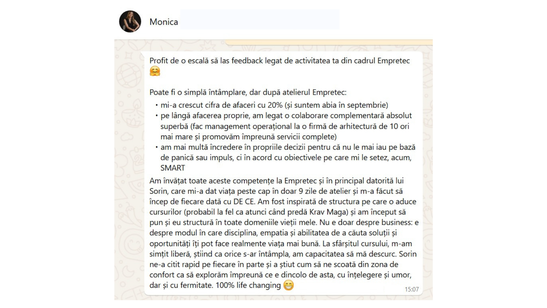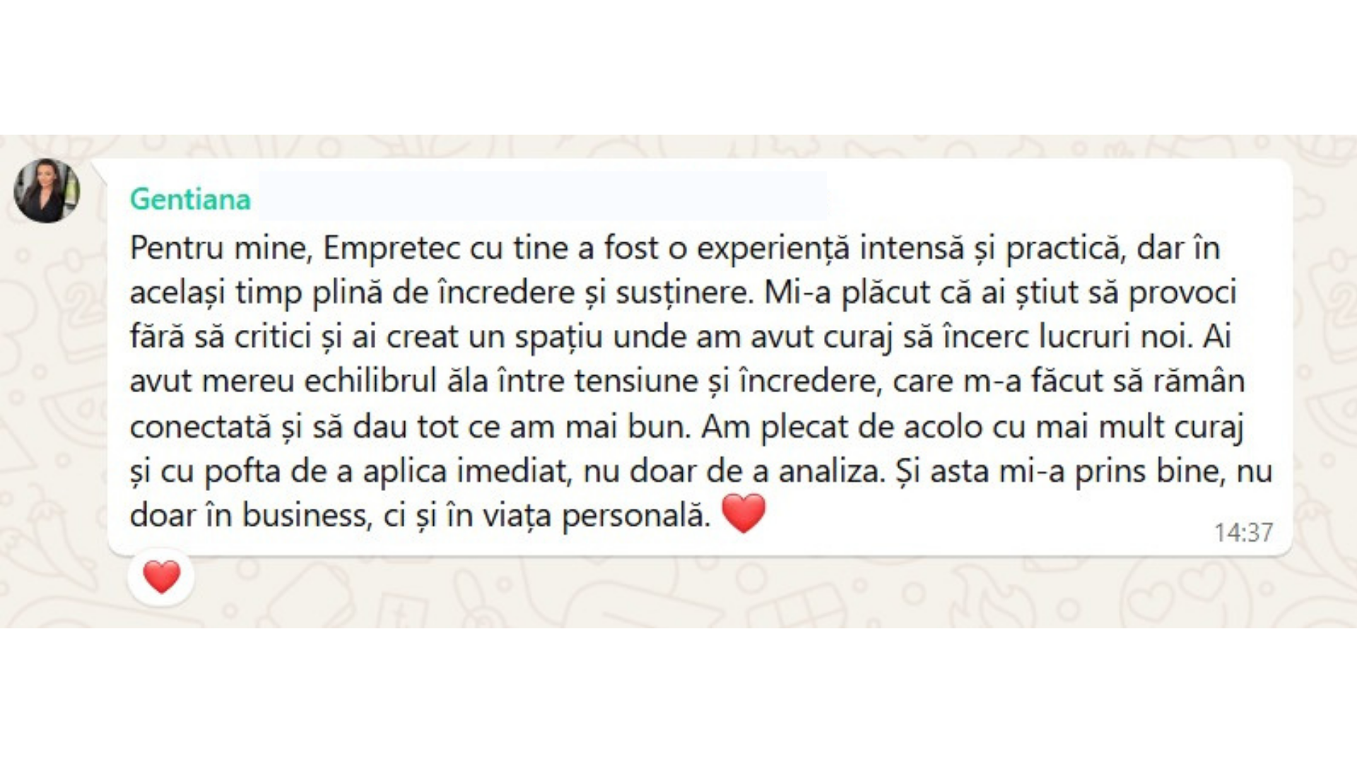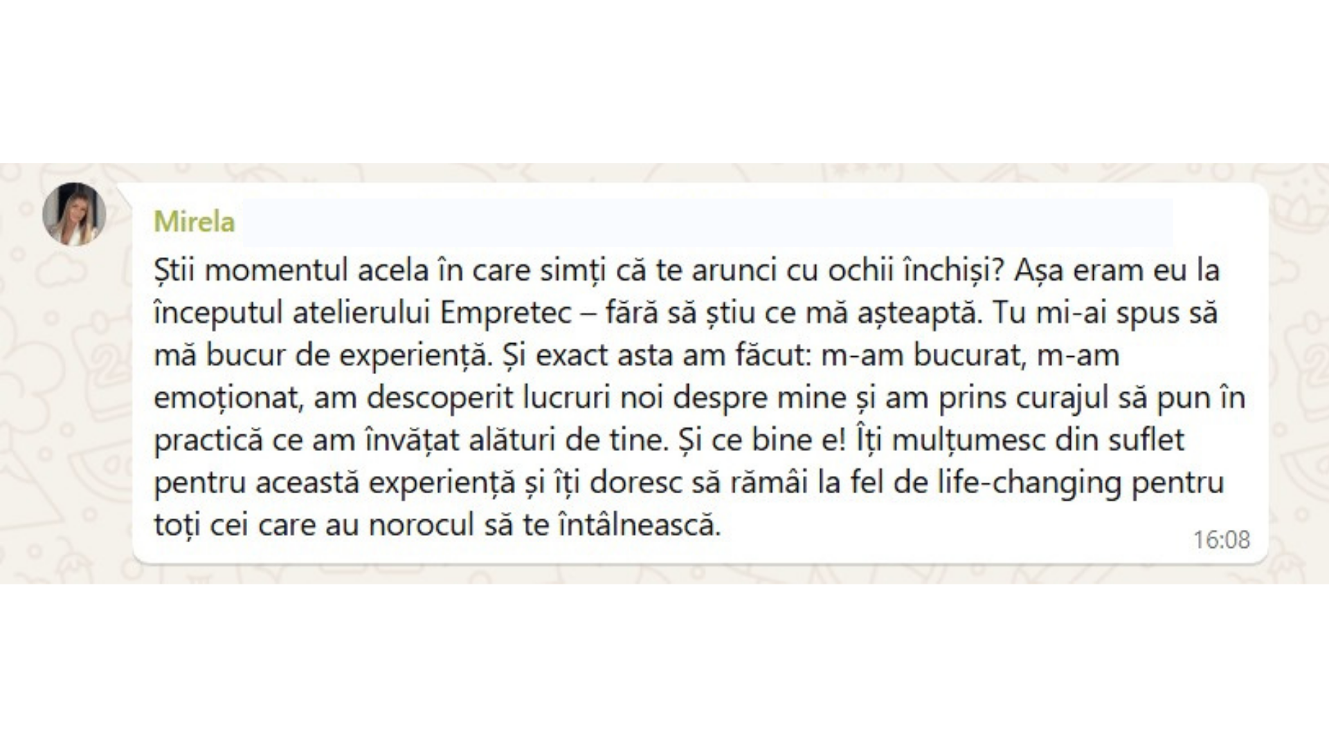 Aceasta este diferența fundamentală. Atelierul lucrează la nivel de identitate, nu doar la nivel de strategie, producând o schimbare profundă și de durată.